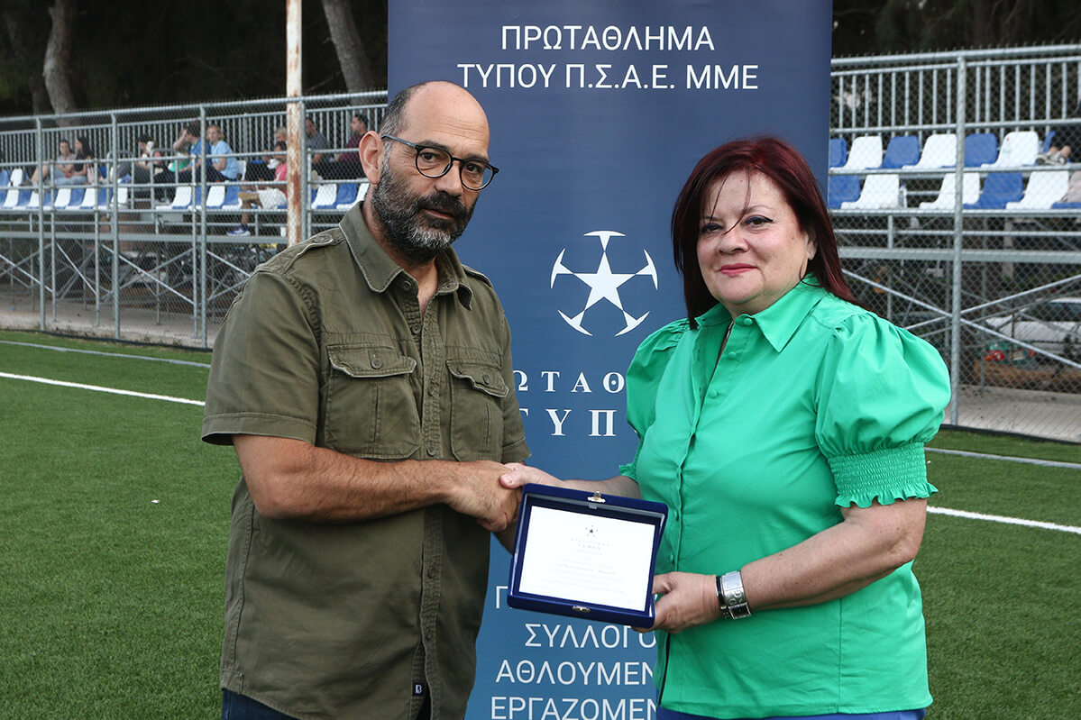 Ο γενικός γραμματέας του συλλόγου, Αγγελος Τσάτσης έκανε τη βράβευση στην αντιδήμαρχο Αθλητισμού και πολιτισμού του Δήμου Χολαργού - Παπάγου, κα Μαρία Αθανασάκου- Μουντάκη και ο πρόεδρος του Π.Σ.Α.Ε. ΜΜΕ, Τάσος Δρακωτός τίμησε την αντιπεριφερειάρχη Βορείου τομέα της Περιφέρειας Αττικής, κα Λουκία Κεφαλογιάννη για την προσφορά & την αλληλεγγύη που επιδεικνύουν στις διοργανώσεις άθλησης των εργαζομένων στα μέσα ενημέρωσης.